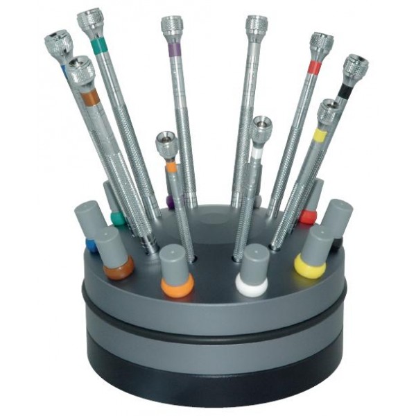 10 destornilladores cromados BERGEON No 30080. ∅ 0.50 - 0.60 - 0.80 - 1.00 - 1.20 - 1.40 - 1.60 - 2.00 - 2.50 - 3.00 mm. Con mechas de recambió en tubo plástico gris.